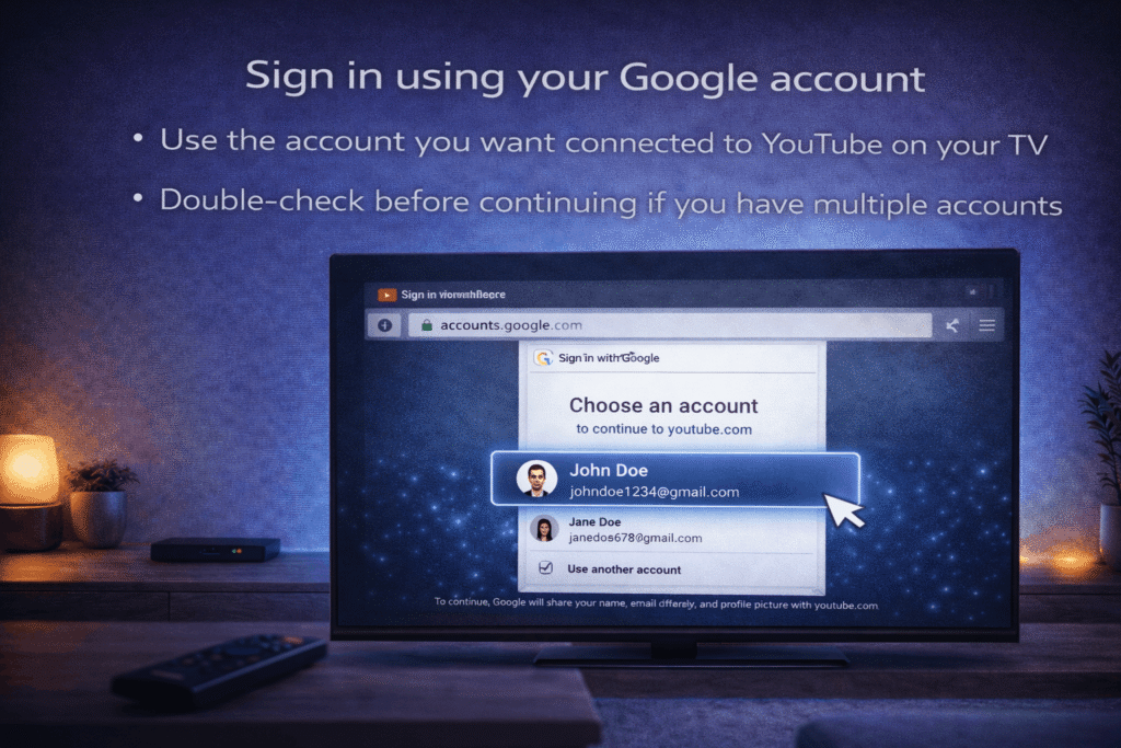 • Use the account you want connected to YouTube on your TV
